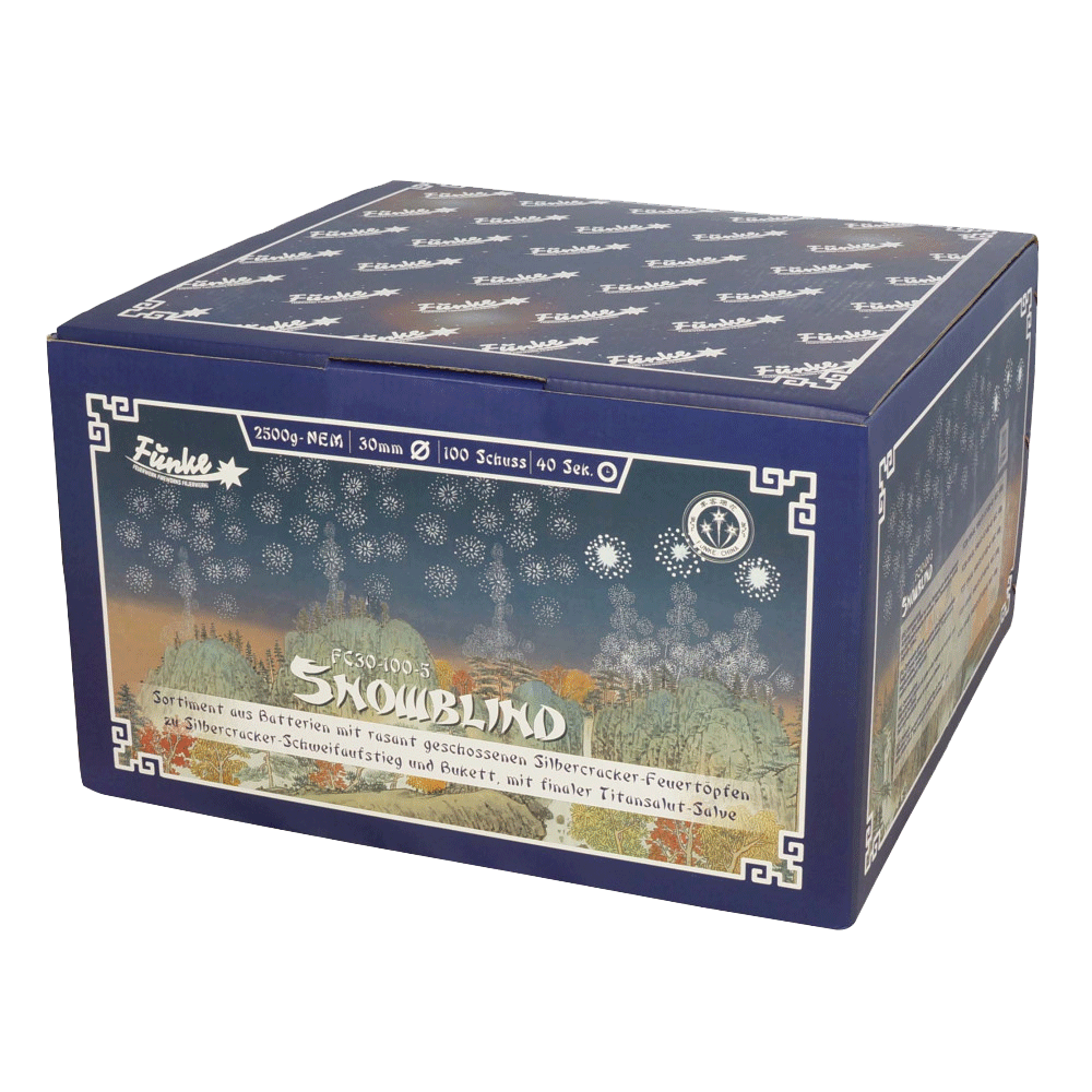 Sortiment aus Batterien mit rasant geschossenen Silbercracker-Feuertöpfen zu Silbercracker-Schweifaufstieg und Bukett, mit finaler Titansalut-Salve.