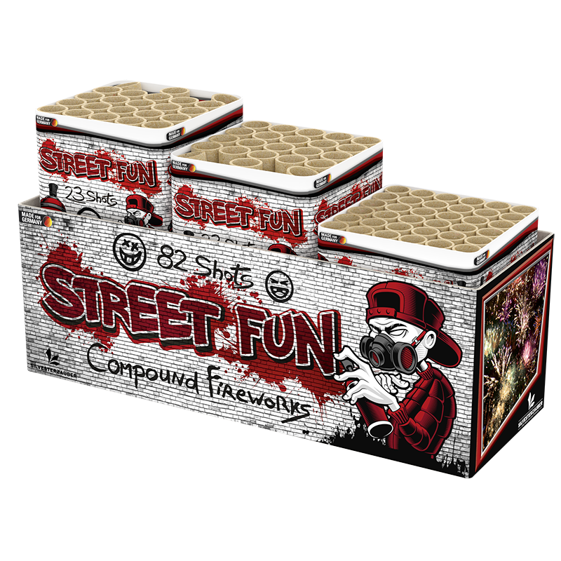 82 Schuss und eine volle Minute Feuerwerksspaß. Ein absolutes Must-Have für Silvester! Compound-Feuerwerk – nur einmal anzünden.