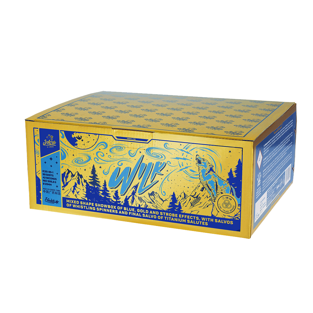 99 Schüsse mit einer Mischung aus blauen, goldenen und stroboskopischen Effekten, mit pfeifenden Spinnern und einer letzten Salve aus Titansaluten.