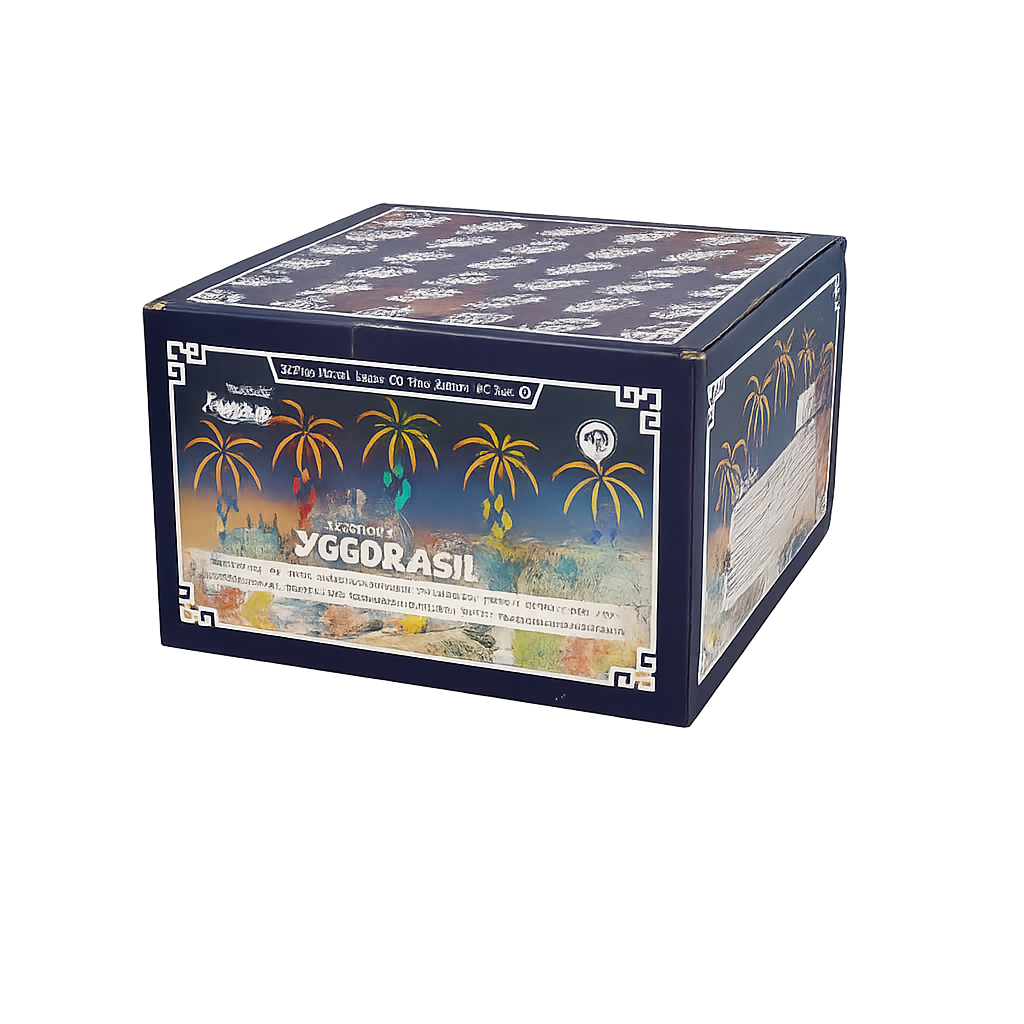Sortiment aus Batterien mit rasant geschossenen bunten Feuertöpfen zu Brokat-Schweifaufstieg und Brokatpalmen-Buketts mit bunten Dahliensternen in 5 verschiedenen Farben.