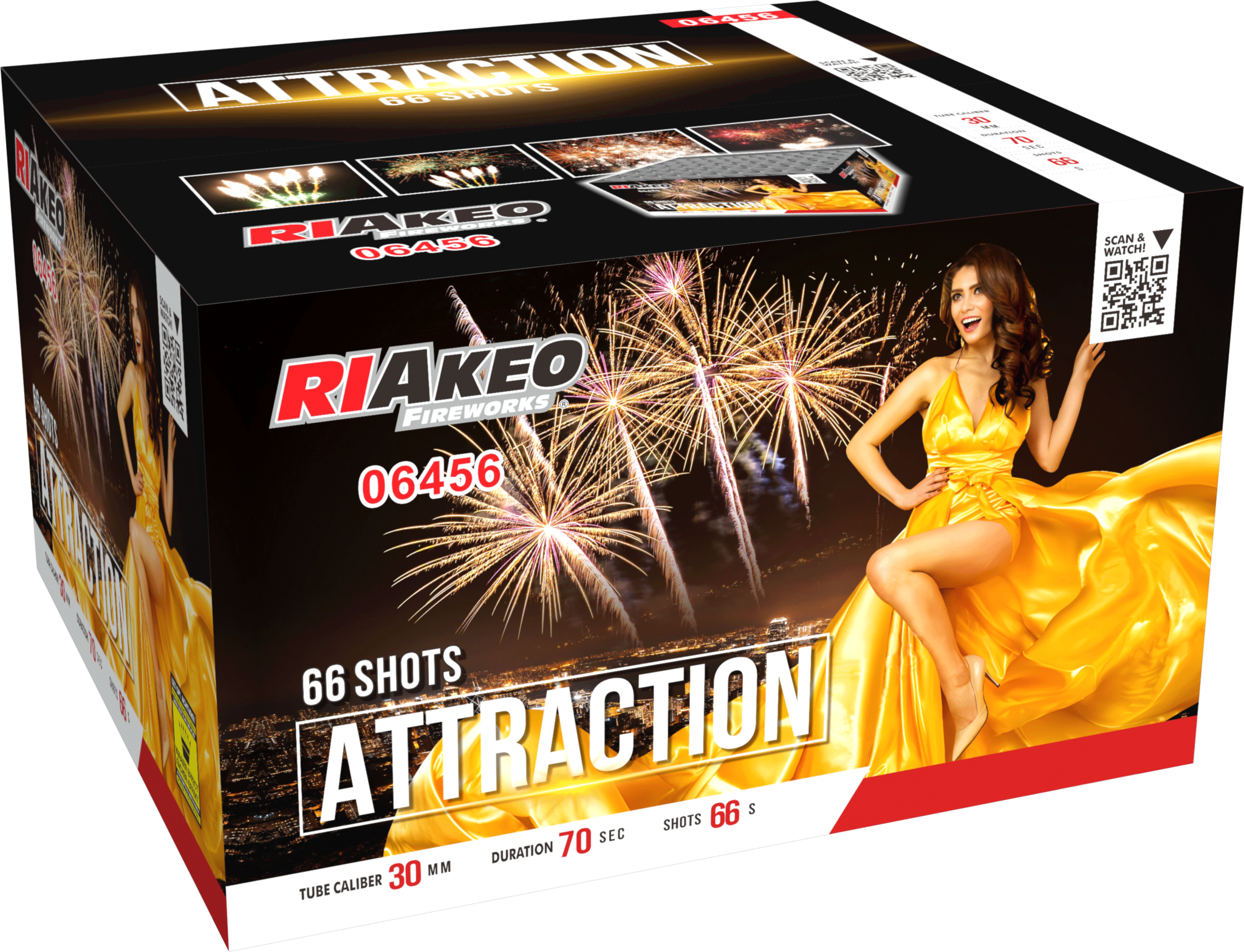 Loaded to the max! Deze Riakeo waaier-compound heeft een rustige opbouw naar een grandioze finale. Chrysanthemum mines onder en silver chrysanthemums boven. Attraction - 06456.