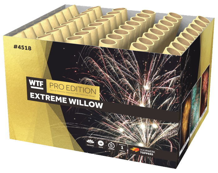 De Extreme Willow is een 48 schots waaiercake. Een diversiteit van golden willow effecten met witte en rode blinkers, felle blauwe sterren en heftige crackling die lang in de lucht blijven hangen. Zo kunt u extra lang van dit product genieten.