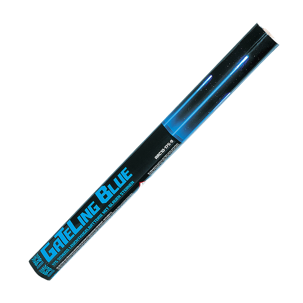 175-schots flare batterij met blauwe sterren. Verkrijgbaar in verschillende kleuren en effecten, voor gebruik in shows etc.