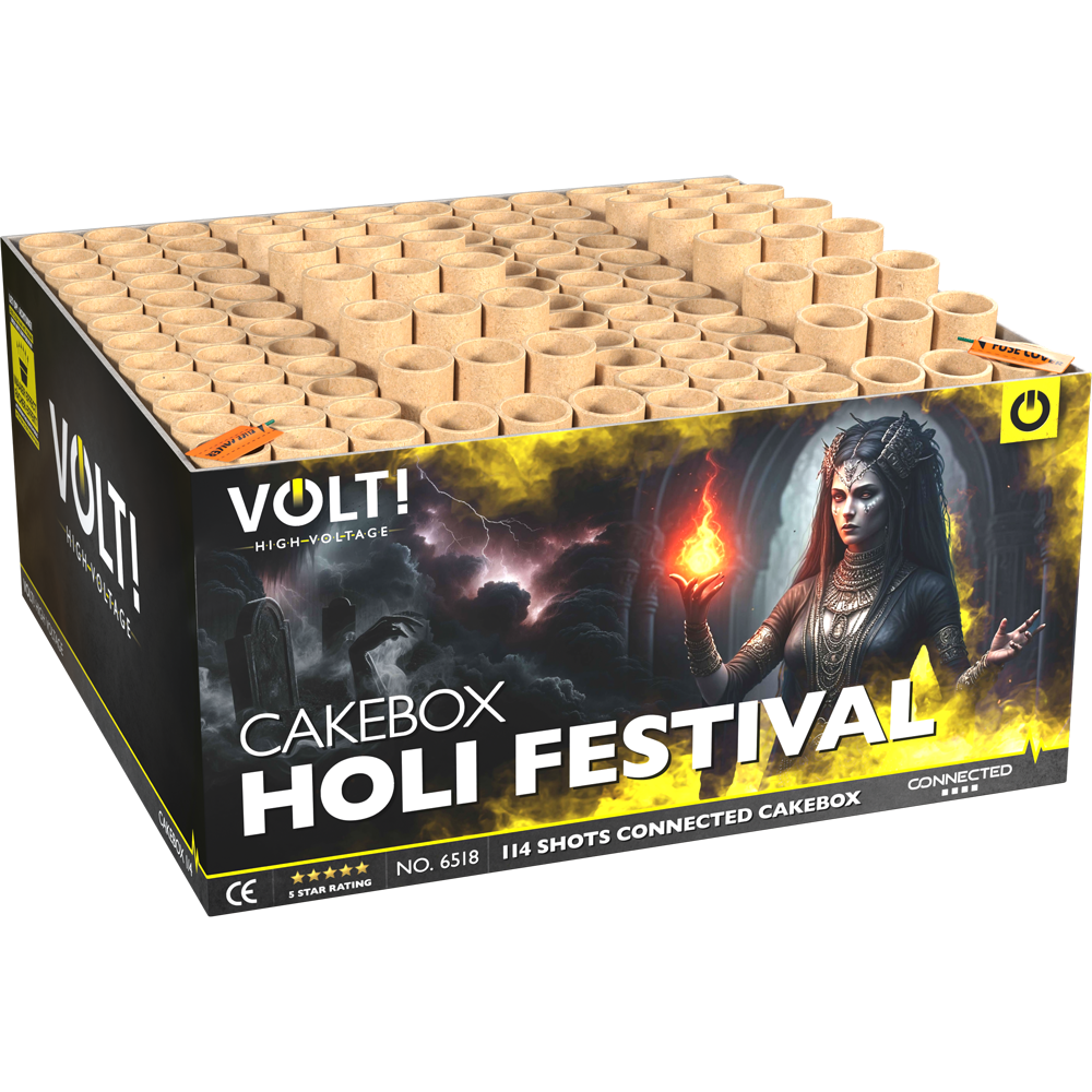 Holi Festival dompelt je volledig onder in kleur! 114 schoten, afwisselend in I-vorm en waaiervorm, geven je het gevoel dat je midden in India staat. Met maar liefst 1,5 kg aan effecten is het typische Holi-gevoel overweldigend aanwezig!