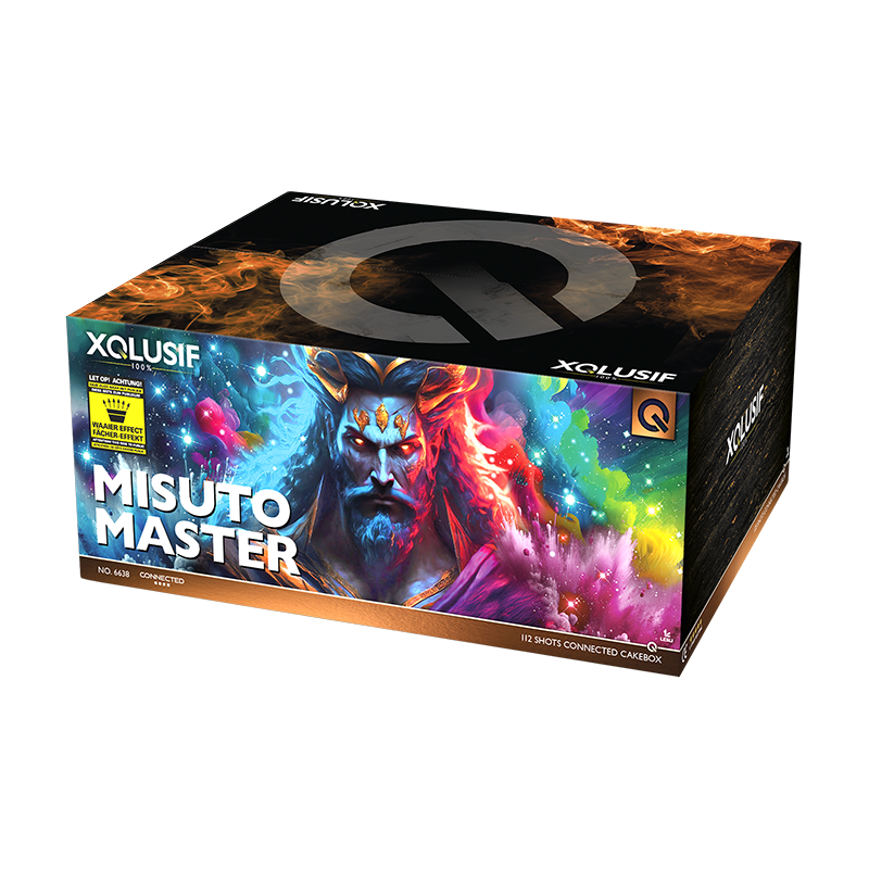 Misuto Master - Ein Feuerwerks-Meisterwerk mit 112 Schüssen! Dieser Compound mit einem atemberaubenden Fächereffekt beeindruckt durch leuchtende farben in Rot, Gelb, Grün und Blau, kombiniert mit eleganten silbernen Stroboskopschweifen. Die synchron gezün