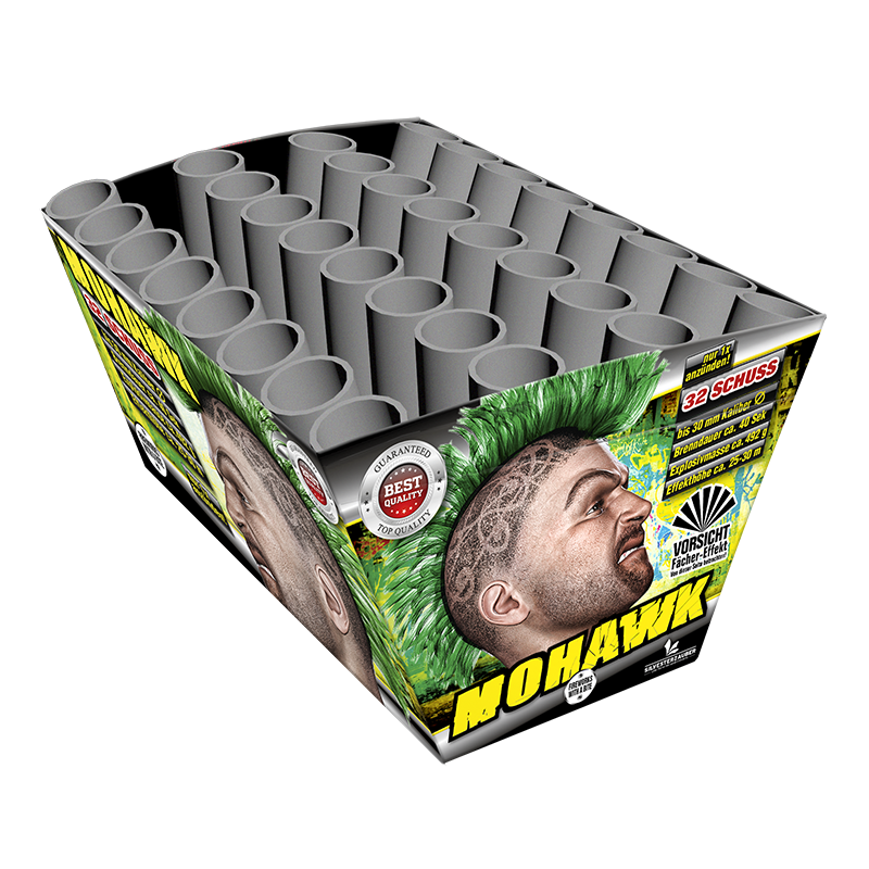 Mega-waaier met 32 grote boeketten en knallen. De hele hemel is gevuld met veel verschillende effecten. De eerste rijen in ruitenwisser-tempo en de laatste rij als salvo.