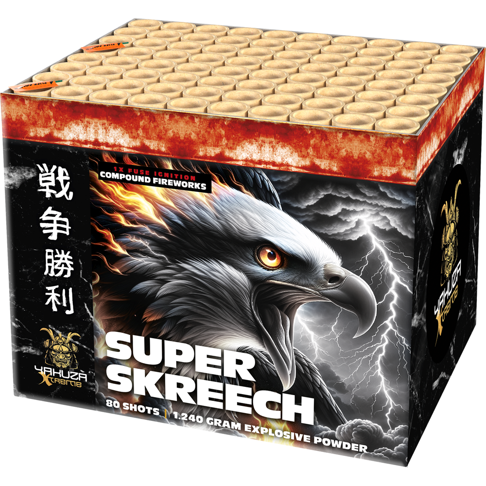 Keine Warnung, keine Gnade. Super Skreech jagt seine silbernen Whistles in einem Tempo in den Himmel, das die Ohren zum Dröhnen bringt. Von rasend schnellen Salven bis zur brachialen gemeinsamen Explosion – Feuerwerk, das man hört, fühlt und sieht.